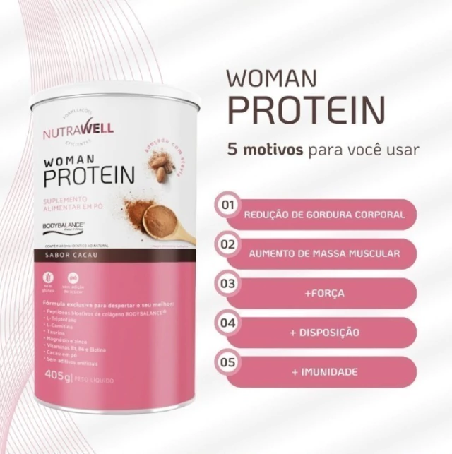 A Woman Protein da Nutrawell é um suplemento inovador desenvolvido por especialistas com nutrientes-chaves para saúde e bem-estar feminino. A sinergia dos ingredientes atua otimizando o funcionamento metabólico para você se transformar em sua melhor versão de dentro para fora.